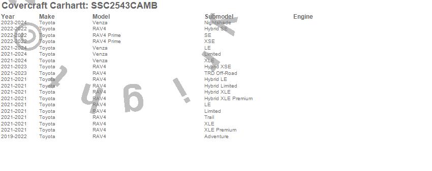 Below is an abbreviated list of applications for the Covercraft Carhartt SeatSaver.RAV4, RAV4 Prime, Venza, Toyota, 2025, 2024, 2023, 2022, 2021, 2020, 2019