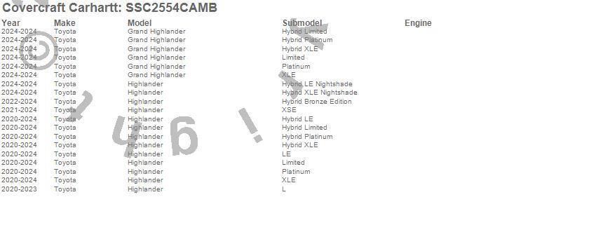 Below is an abbreviated list of applications for the Covercraft Carhartt SeatSaver.Grand Highlander, Highlander, Toyota, 2025, 2024, 2023, 2022, 2021, 2020