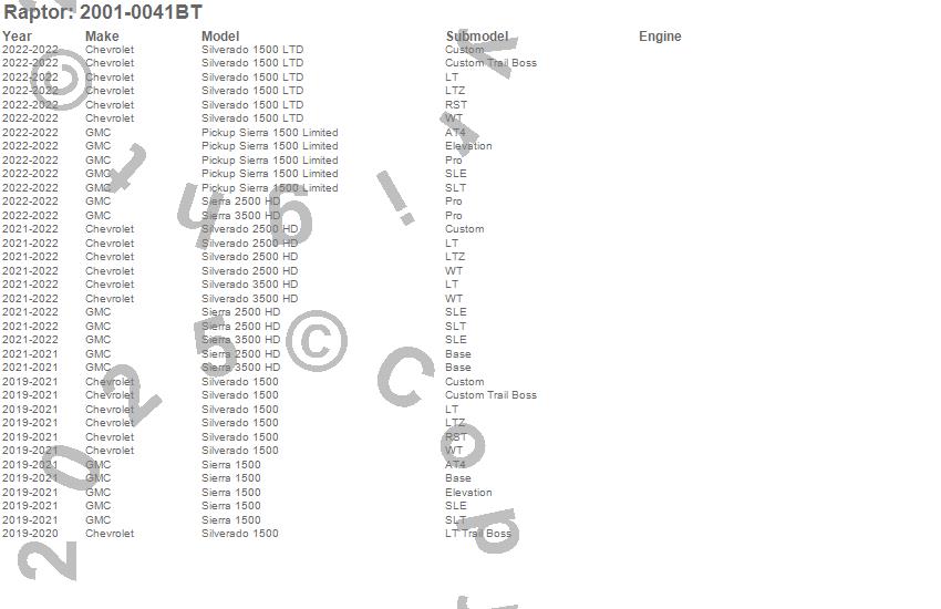 Brand: RaptorPart Number: 2001-0041BTRunning Board Type: 5 in. - Black Textured - Rocker Panel MountUPC: 813443027264