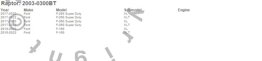 Brand: RaptorPart Number: 2003-0300BTRunning Board Type: 5 in. - Black Textured - Rocker Panel MountUPC: 813443027950