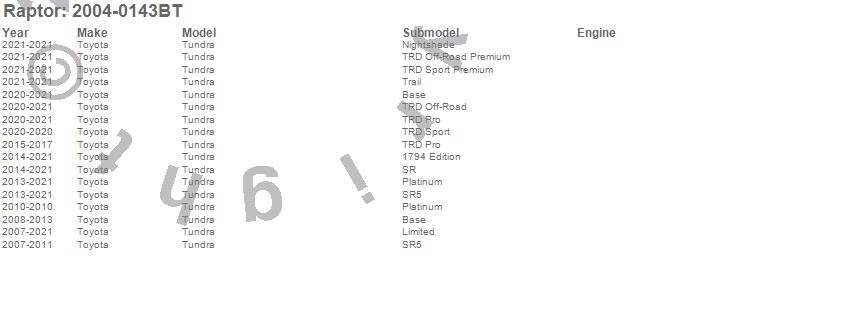 Brand: RaptorPart Number: 2004-0143BTRunning Board Type: 5 in. - Black Textured - Rocker Panel MountUPC: 813443027509