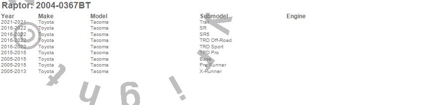 Brand: RaptorPart Number: 2004-0367BTRunning Board Type: 5 in. - Black Textured - Rocker Panel MountUPC: 813443027523