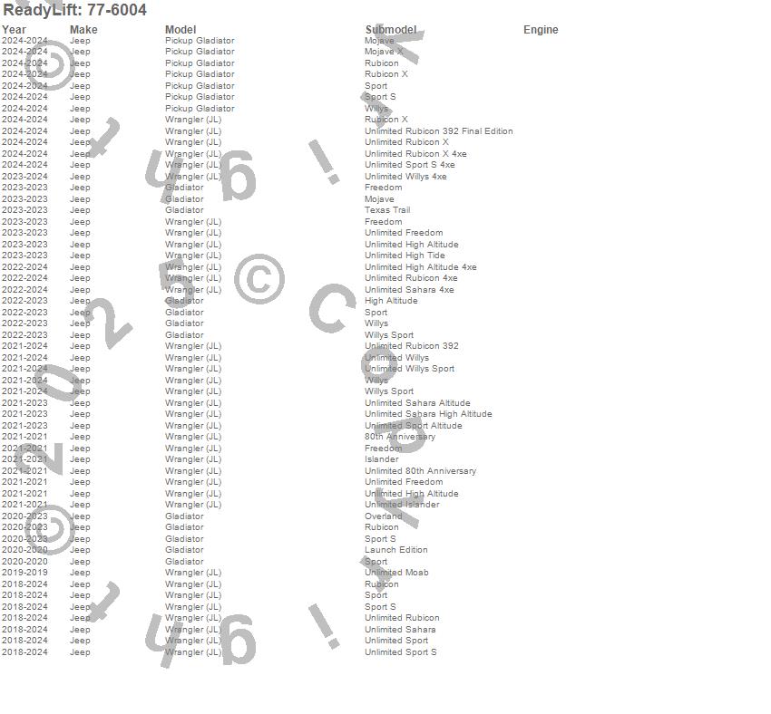 Below is an abbreviated list of applications for the Track Bar.Gladiator, Pickup Gladiator, Wrangler, Wrangler (JL), Jeep, 2025, 2024, 2023, 2022, 2021, 2020, 2019, 2018