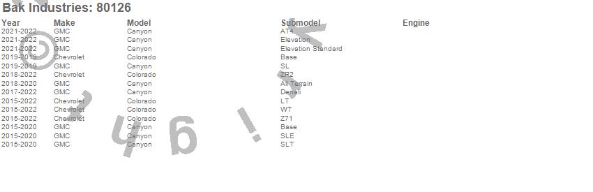 Brand: BAK IndustriesPart Number: 80126Tonneau Cover Type: Black - Vinyl Top w/ Aluminum Underside - Matte Black FinishUPC: 192631032090