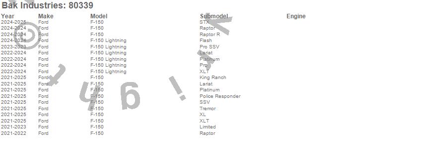 Brand: BAK IndustriesPart Number: 80339Tonneau Cover Type: Black - Vinyl Top w/ Aluminum Underside - Matte Black FinishUPC: 192631033165