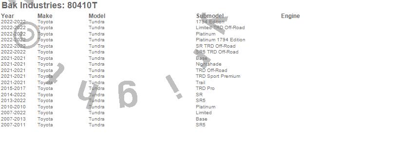 Brand: BAK IndustriesPart Number: 80410TTonneau Cover Type: Black - Vinyl Top w/ Aluminum Underside - Matte Black FinishUPC: 192631032502