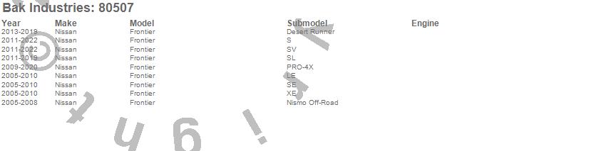 Brand: BAK IndustriesPart Number: 80507Tonneau Cover Type: Black - Vinyl Top w/ Aluminum Underside - Matte Black FinishUPC: 192631032441