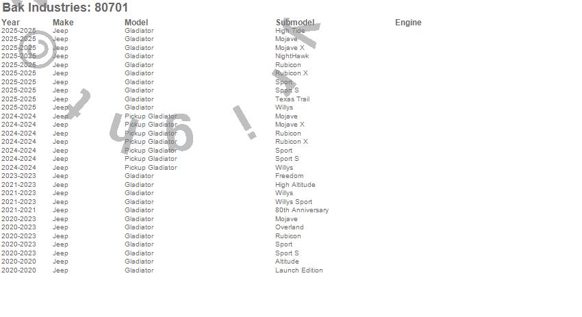 Brand: BAK IndustriesPart Number: 80701Tonneau Cover Type: Black - Vinyl Top w/ Aluminum Underside - Matte Black FinishUPC: 192631032489