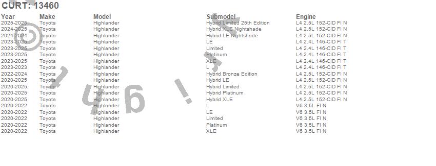Below is an abbreviated list of applications for the Class III 2 in. Receiver Hitch.Highlander, Toyota, 2025, 2024, 2023, 2022, 2021, 2020