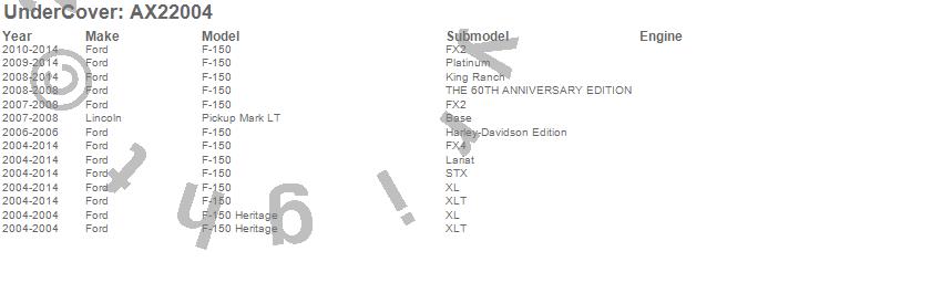 Below is an abbreviated list of applications for the Armor Flex Tonneau Cover.F-150, F-150 Heritage, Mark LT, Ford, Lincoln, 2014, 2013, 2012, 2011, 2010, 2009, 2008, 2007, 2006, 2005, 2004