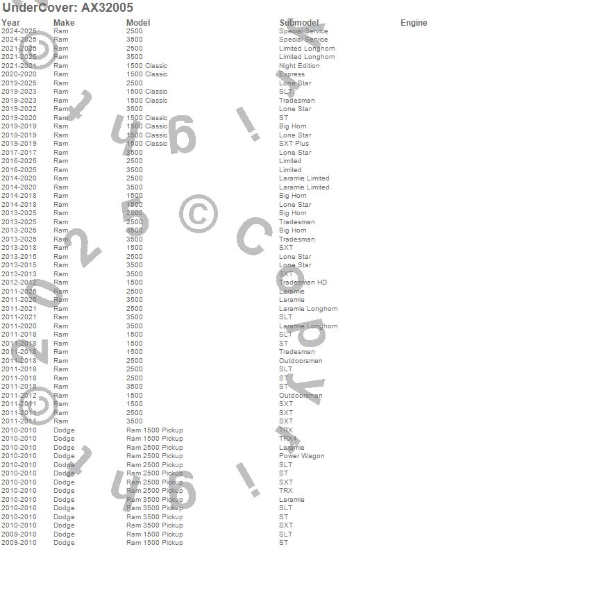 Below is an abbreviated list of applications for the Armor Flex Tonneau Cover.1500, 1500 Classic, 2500, 3500, Ram 1500, Ram 2500, Ram 3500, Dodge, Ram, 2025, 2024, 2023, 2022, 2021, 2020, 2019, 2018, 2017, 2016, 2015