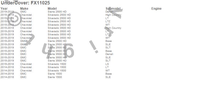 Below is an abbreviated list of applications for the FLEX Tonneau Cover.Sierra 1500, Sierra 2500 HD, Sierra 3500 HD, Silverado 1500, Silverado 2500 HD, Silverado 3500 HD, Chevrolet, GMC, 2019, 2018, 2017, 2016, 2015, 2014