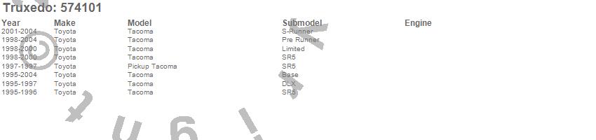 Below is an abbreviated list of applications for the TruXedo Lo Pro QT Tonneau Cover.Tacoma, Toyota, 2004, 2003, 2002, 2001, 2000, 1999, 1998, 1997, 1996, 1995