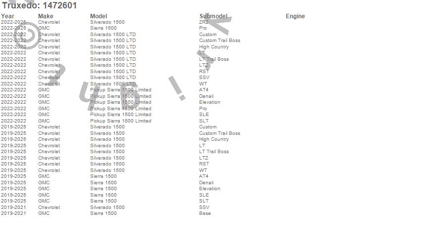 Below is an abbreviated list of applications for the Pro X15 Tonneau Cover.Pickup Sierra 1500 Limited, Sierra 1500, Silverado 1500, Silverado 1500 LTD, Chevrolet, GMC, 2026, 2025, 2024, 2023, 2022, 2021, 2020, 2019