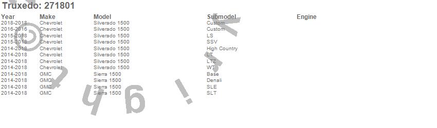 Below is an abbreviated list of applications for the TruXport Tonneau Cover.Sierra 1500, Silverado 1500, Chevrolet, GMC, 2018, 2017, 2016, 2015, 2014