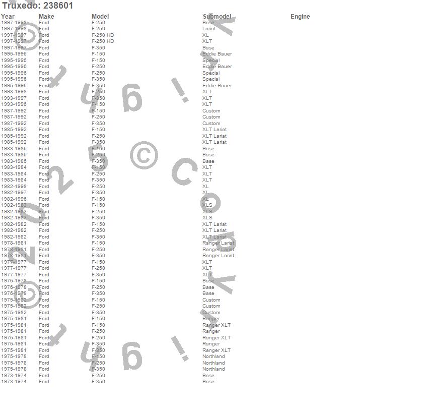 Below is an abbreviated list of applications for the TruXport Tonneau Cover.F-150, F-250, F-250 HD, F-350, Ford, 1998, 1997, 1996, 1995, 1994, 1993, 1992, 1991, 1990, 1989, 1988, 1987, 1986, 1985, 1984