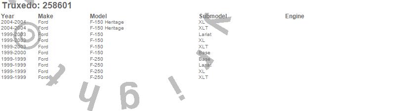 Below is an abbreviated list of applications for the TruXport Tonneau Cover.F-150, F-150 Heritage, F-250, Ford, 2004, 2003, 2002, 2001, 2000, 1999