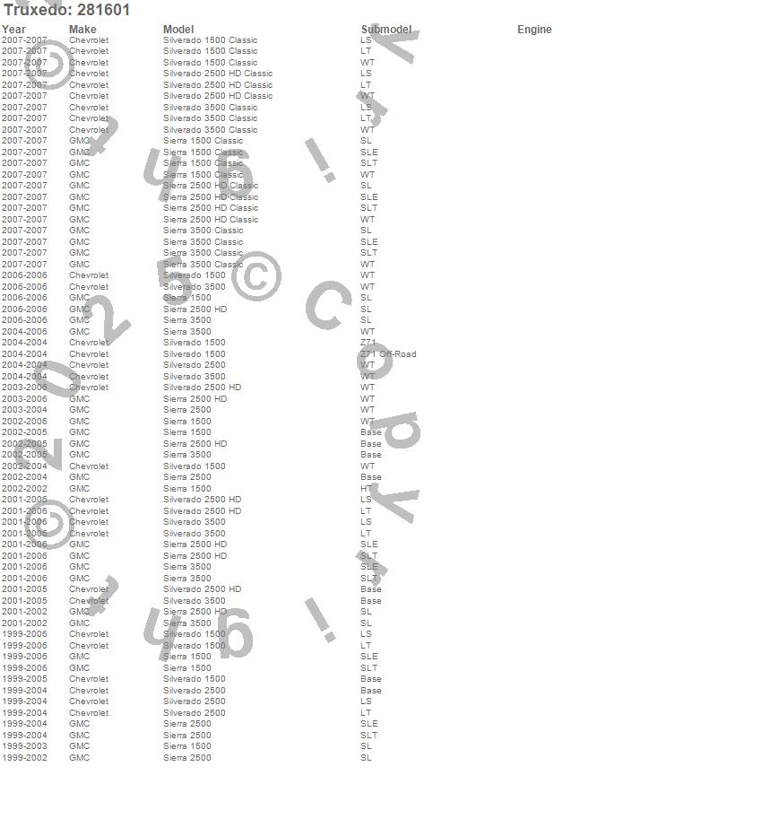 Below is an abbreviated list of applications for the TruXport Tonneau Cover.Sierra 1500, Sierra 1500 Classic, Sierra 2500, Sierra 2500 HD, Sierra 2500 HD Classic, Sierra 3500, Sierra 3500 Classic, Silverado 1500, Silverado 1500 Classic, Silverado 2500, Silverado 2500 HD, Silverado 2500 HD Classic, Silverado 3500, Silverado 3500 Classic, Chevrolet, GMC, 2007, 2006, 2005, 2004