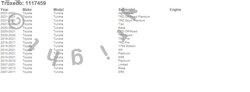 Below is an abbreviated list of applications for the TonneauMate Clamp Kit.Tundra, Toyota, 2021, 2020, 2019, 2018, 2017, 2016, 2015, 2014, 2013, 2012, 2011, 2010, 2009, 2008, 2007