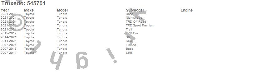 Below is an abbreviated list of applications for the TruXedo Lo Pro QT Tonneau Cover.Tundra, Toyota, 2021, 2020, 2019, 2018, 2017, 2016, 2015, 2014, 2013, 2012, 2011, 2010, 2009, 2008, 2007