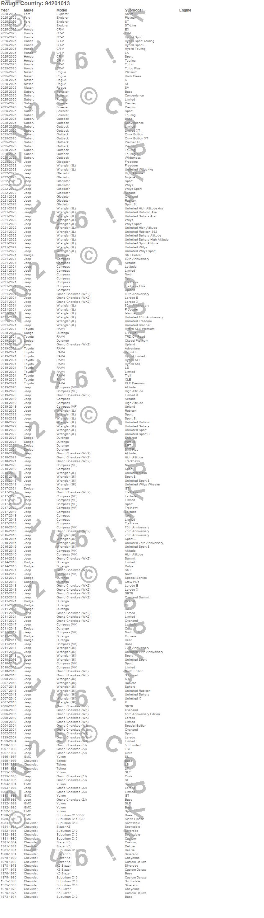 Below is an abbreviated list of applications for the Series 94 Wheel.Blazer K5, C10 Suburban, Compass, CR-V, Durango, Explorer, Forester, Gladiator, Grand Cherokee (WJ), Grand Cherokee (WK), Grand Cherokee (WK2), Grand Cherokee (ZJ), K5 Blazer, Outback, R1500 Suburban, RAV4, Rogue, Tahoe, Wrangler (JK), Wrangler (JL)