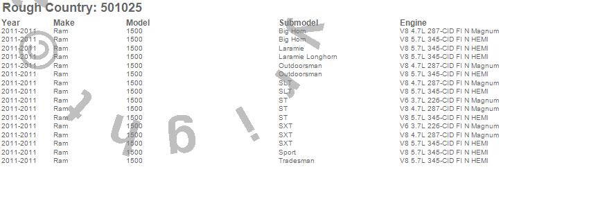 Brand: Rough CountryPart Number: 501025Suspension Front Leveling Kit Type: Front - 2.5 in.UPC: 843030170080