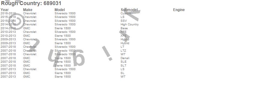 Brand: Rough CountryPart Number: 689031Coil Over Shock Absorber Type: Front - 3.5 in. LiftUPC: 843030198107