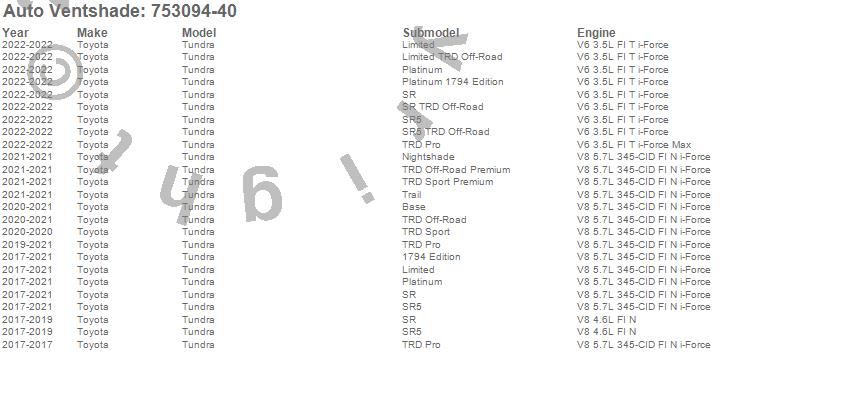 Below is an abbreviated list of applications for the Aeroskin LightShield Hood Protector.Tundra, Toyota, 2022, 2021, 2020, 2019, 2018, 2017