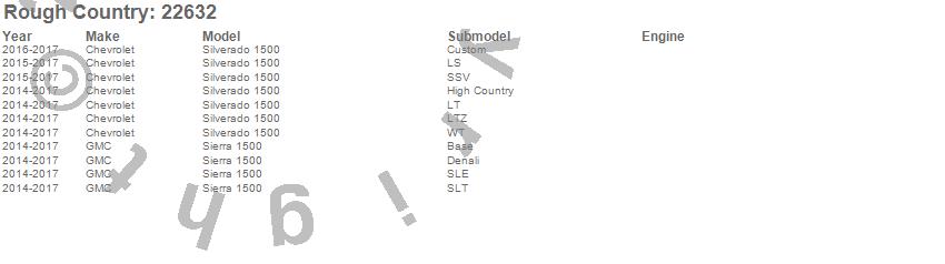 Brand: Rough CountryPart Number: 22632Lift Kit-Suspension w/Shock Type: 6 in. Lift Kit - Cast Steel - w/N3 Sruts andampUPC: 843030199135