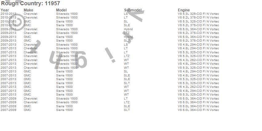 Below is an abbreviated list of applications for the Suspension Lift Kit w/Shocks.Sierra 1500, Silverado 1500, Chevrolet, GMC, 2013, 2012, 2011, 2010, 2009, 2008, 2007