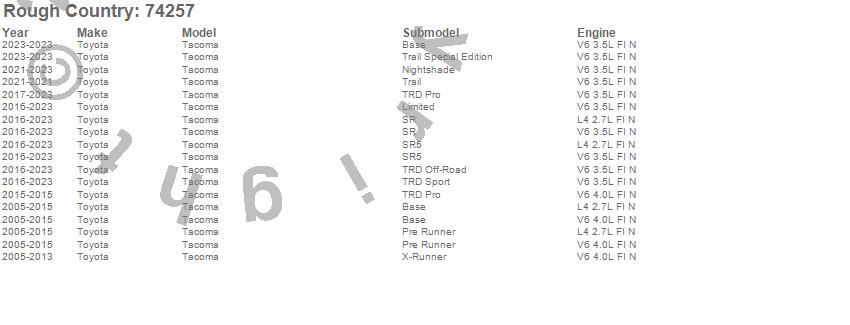 Brand: Rough CountryPart Number: 74257Lift Kit-Suspension w/Shock Type: 3.5 in. Lift - w/Vertex Coilovers And V2 Rear ShocksUPC: 843030198671