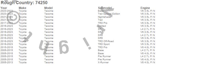 Brand: Rough CountryPart Number: 74250Lift Kit-Suspension w/Shock Type: 3.5 in. Lift - w/Vertex Coilovers And Vertex ShocksUPC: 843030198725