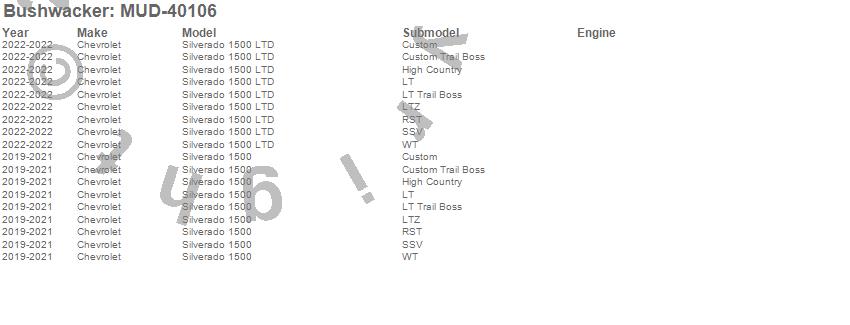 Below is an abbreviated list of applications for the TrailArmor Mud Flaps.Silverado 1500, Silverado 1500 LTD, Chevrolet, 2022, 2021, 2020, 2019