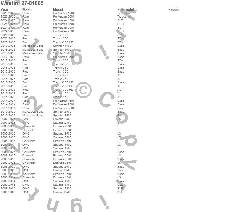 Below is an abbreviated list of applications for the Grate Steps Running Boards.Express 1500, Express 2500, Express 3500, ProMaster 1500, ProMaster 2500, ProMaster 3500, Savana 1500, Savana 2500, Savana 3500, Sprinter 1500, Sprinter 2500, Sprinter 3500, Sprinter 3500XD, Sprinter 4500, Transit-150, Transit-250, Transit-350, Transit-350 HD, Chevrolet, Ford