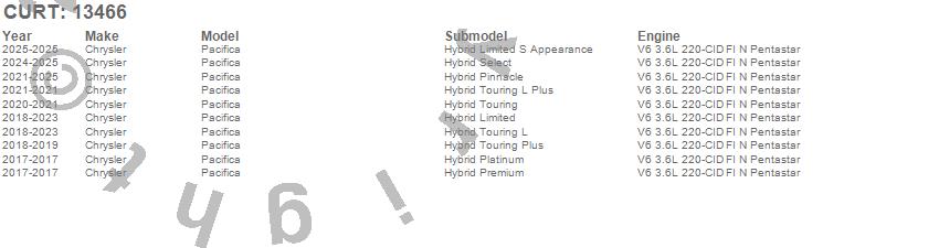Below is an abbreviated list of applications for the Class III 2 in. Receiver Hitch.Pacifica, Chrysler, 2026, 2025, 2024, 2023, 2022, 2021, 2020, 2019, 2018, 2017