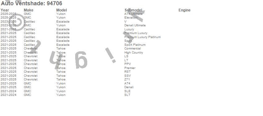 Below is an abbreviated list of applications for the Ventvisor Deflector 4 pc..Escalade, Tahoe, Yukon, Cadillac, Chevrolet, GMC, 2026, 2025, 2024, 2023, 2022, 2021