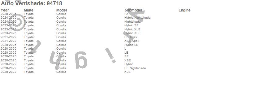 Below is an abbreviated list of applications for the Ventvisor Deflector 4 pc..Corolla, Toyota, 2026, 2025, 2024, 2023, 2022, 2021, 2020