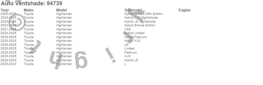 Below is an abbreviated list of applications for the Ventvisor Deflector 4 pc..Highlander, Toyota, 2025, 2024, 2023, 2022, 2021, 2020