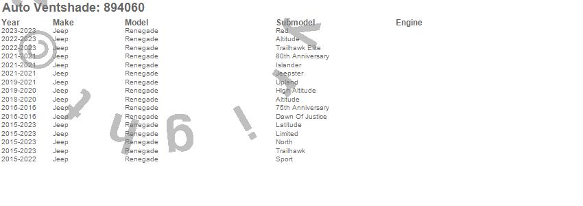 Below is an abbreviated list of applications for the Ventvisor Low Profile Deflector 4 pc..Renegade, Jeep, 2023, 2022, 2021, 2020, 2019, 2018, 2017, 2016, 2015