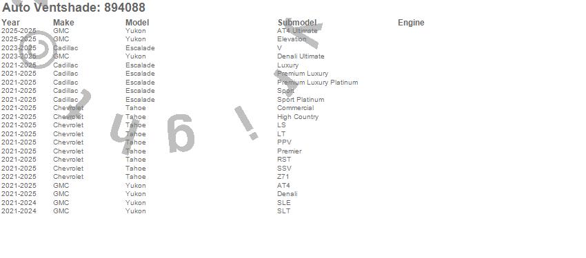 Below is an abbreviated list of applications for the Ventvisor Low Profile Deflector 4 pc..Escalade, Tahoe, Yukon, Cadillac, Chevrolet, GMC, 2025, 2024, 2023, 2022, 2021