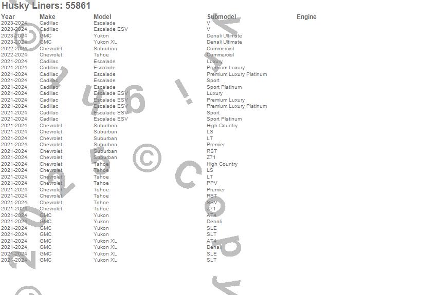 Below is an abbreviated list of applications for the X-act Contour Floor Liner.Escalade, Escalade ESV, Suburban, Tahoe, Yukon, Yukon XL, Cadillac, Chevrolet, GMC, 2026, 2025, 2024, 2023, 2022, 2021
