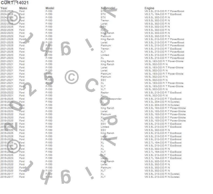 Below is an abbreviated list of applications for the Class IV 2 in. Receiver Hitch.F-150, Ford, 2025, 2024, 2023, 2022, 2021, 2020, 2019, 2018, 2017, 2016, 2015