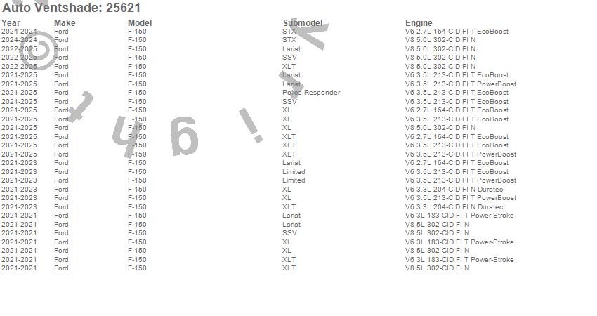 Below is an abbreviated list of applications for the Bugflector II Stone/Bug Deflector.F-150, Ford, 2026, 2025, 2024, 2023, 2022, 2021