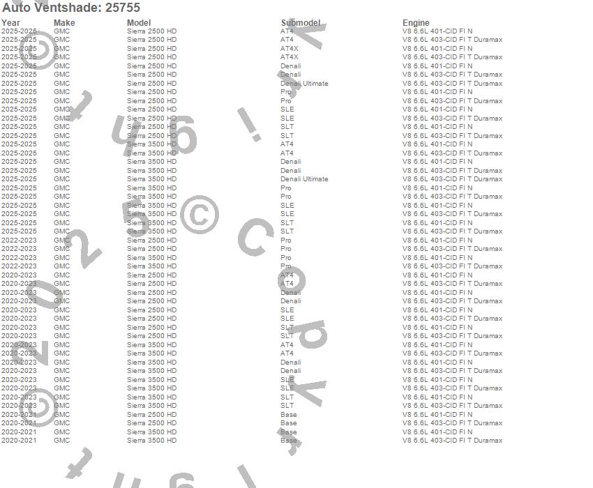 Below is an abbreviated list of applications for the Bugflector II Stone/Bug Deflector.Sierra 2500 HD, Sierra 3500 HD, GMC, 2025, 2024, 2023, 2022, 2021, 2020