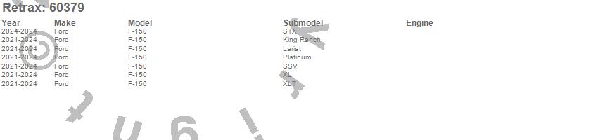 Brand: RetraxPart Number: 60379Tonneau Cover Type: Matte One Piece Polycarbonate Finish - w/o Stake PocketsUPC: 840563104780