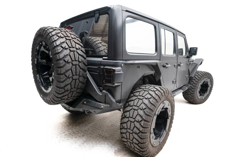 Buy this Off The Door Tire Carrier Fab Fours JL18-Y1851T-1 2 Stage Matte Black Powder Coated here at SVCustoms.com an authorized Fab Fours Spare Tire Carrier dealer and distributor.