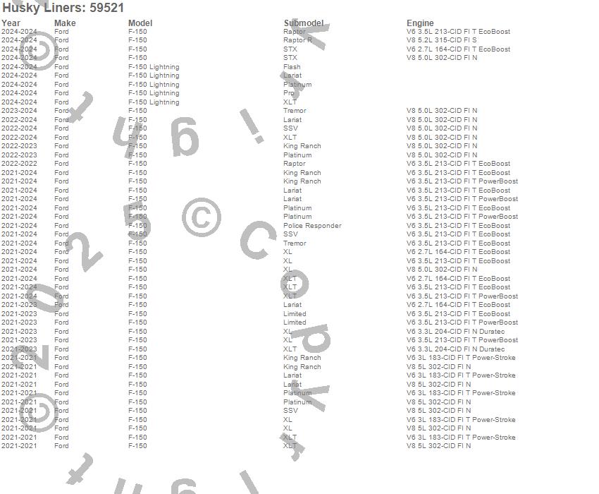 Below is an abbreviated list of applications for the Custom Molded Mud Guards.F-150, F-150 Lightning, Ford, 2025, 2024, 2023, 2022, 2021