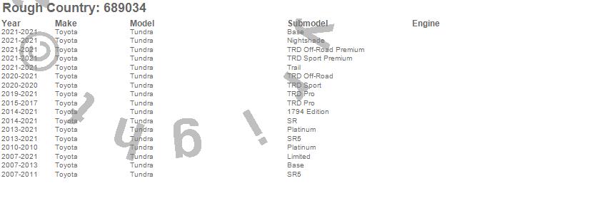 Brand: Rough CountryPart Number: 689034Coil Over Shock Absorber Type: Extended Length 26.69 in. - Collapsed Length 20.79 in.UPC: 843030105105