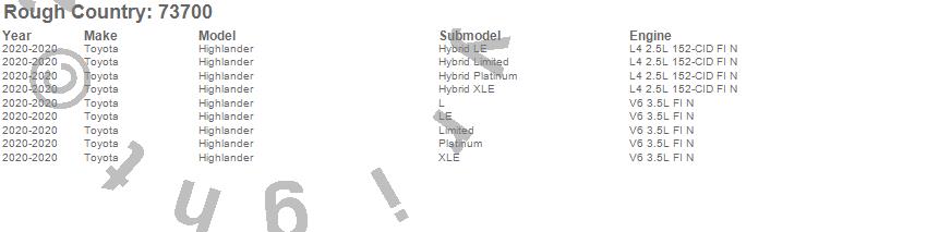 Below is an abbreviated list of applications for the Suspension Lift Kit.Highlander, Toyota, 2020