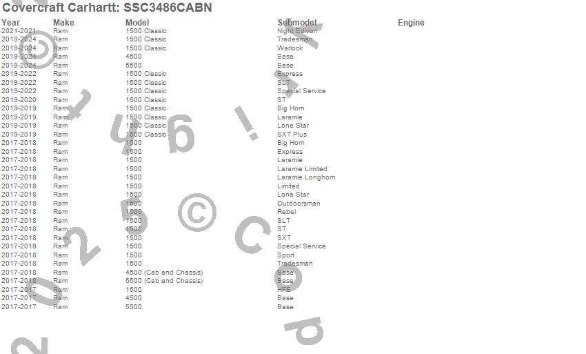 Below is an abbreviated list of applications for the Covercraft Carhartt SeatSaver.1500, 1500 Classic, 4500, 5500, Ram, 2025, 2024, 2023, 2022, 2021, 2020, 2019, 2018, 2017